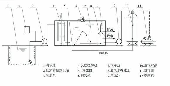 加壓溶氣氣浮在國內外應用廣泛,該法師將原水加壓至0.3~0.4MPA,同時通入空氣,使空氣溶解與水中并達到相應壓力狀態下的飽和值,然后驟然減至常壓,溶解于水中的空氣以微小氣泡的形式從水中釋放出來,氣泡直徑約為Ø20~Ø100μm左右,目前的基本流程有全部進水加壓溶氣氣浮、部分進水加壓溶氣氣浮、部分處理水回流加壓溶氣氣浮等三種,都是由加壓泵、溶氣罐、釋放器和氣浮池等基本設備組成。