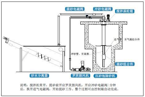 由于葉輪葉漿向上傾斜,旋轉時將使池中的污水呈螺旋狀加速,形成渦流態,產生留心力。同時池內污水流在葉輪葉片攪拌剪切力的作用下,互相剝離,依靠砂的自身重力和旋流的離心力,使砂粒沿池壁呈螺旋線加速沉降,向中心砂斗積聚,經氣提或泵提升后排出池外作進一步的處理。在此過程中,適當的槳葉角度和線速度條件,使污水中的砂粒受到沖刷,并保持好的沉降效果,而原來粘附在砂粒上的有機物,以及重量小的物質,隨污水一同流出旋流沉砂池,進入后續工序繼續處理,砂與少量污水進入池外砂水分離器內,砂經分離后外排,污水回流至格柵井。
